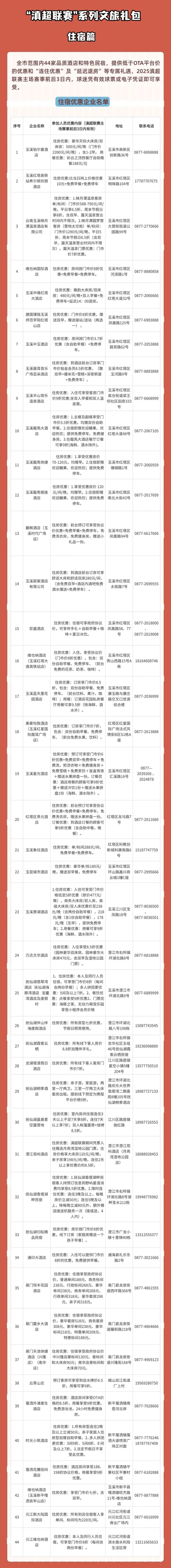 玉溪市范圍內(nèi)44家品質(zhì)酒店和特色民宿,提供低于OTA平臺價的優(yōu)惠和“連住優(yōu)惠”及“延遲退房”等專屬禮遇,滇超聯(lián)賽主場賽事前后3日內(nèi),球迷憑有效球票或電子憑證即可享受。