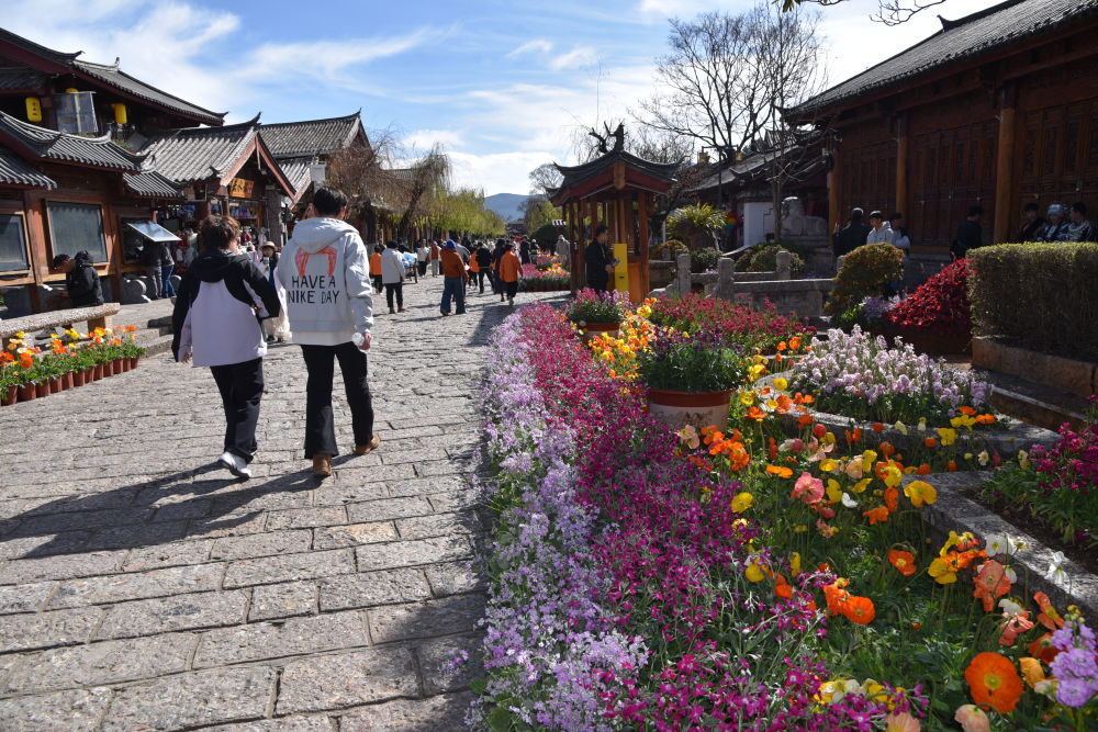 市民游客漫步在麗江古城的春花之間。(麗江融媒記者 段玉菊 攝)