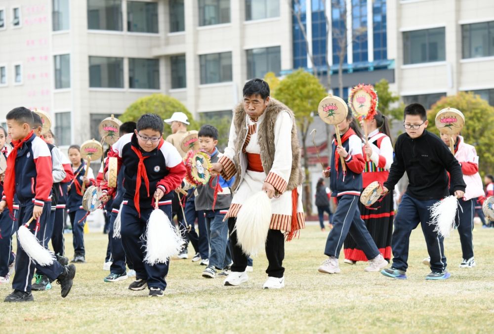 活動中,來自玉龍縣的納西族勒巴舞非物質文化遺產代表性傳承人李學高帶著小學生們熟悉舞蹈道具,耐心教授孩子們勒巴舞的動作要領,小學生們模仿著老師,一邊跳,一邊敲擊著鼓面,可愛又認真。