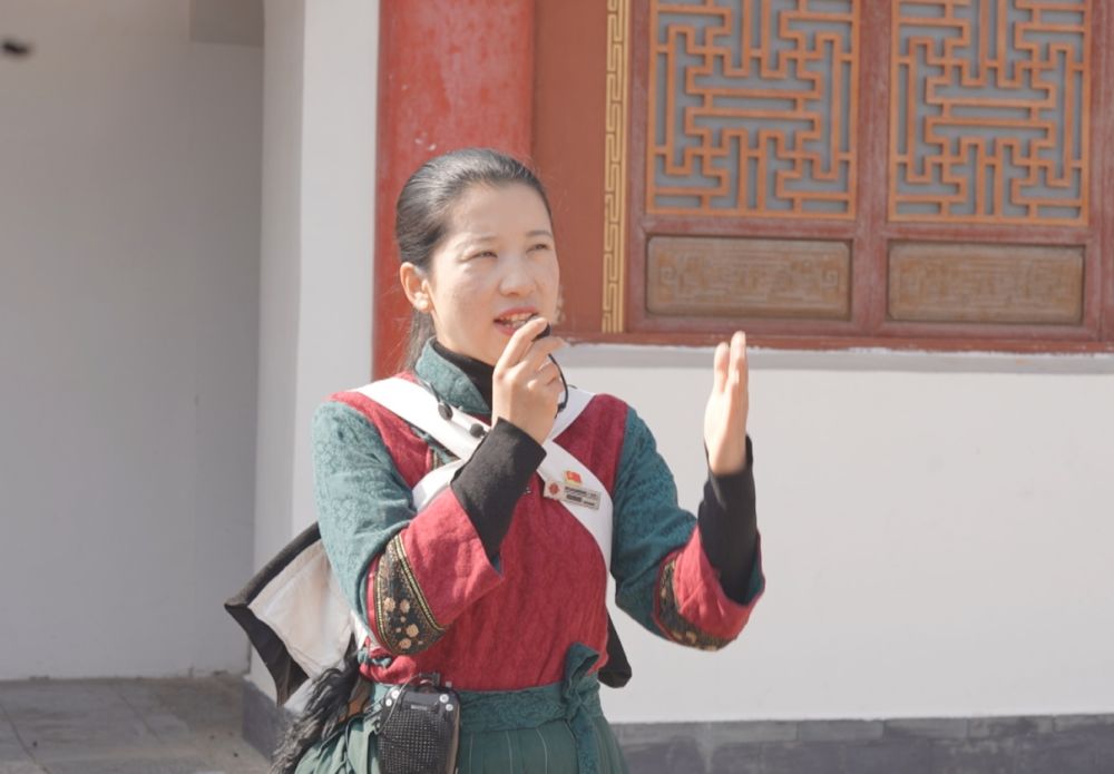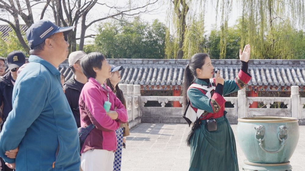 和茂蝶正向來(lái)麗游客講解木府文化。(麗江融媒記者 木雯嬌 攝)