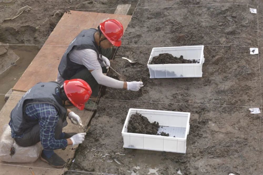 在河泊所遺址考古發(fā)掘現(xiàn)場,一幅有序而專注的圖景徐徐展開:考古人員或俯身細(xì)致清理探方,或操作擺臂吊將土樣運(yùn)出,以便后續(xù)水洗篩選——每一鏟土、每一片陶,都可能蘊(yùn)藏著兩千年前的密碼。
