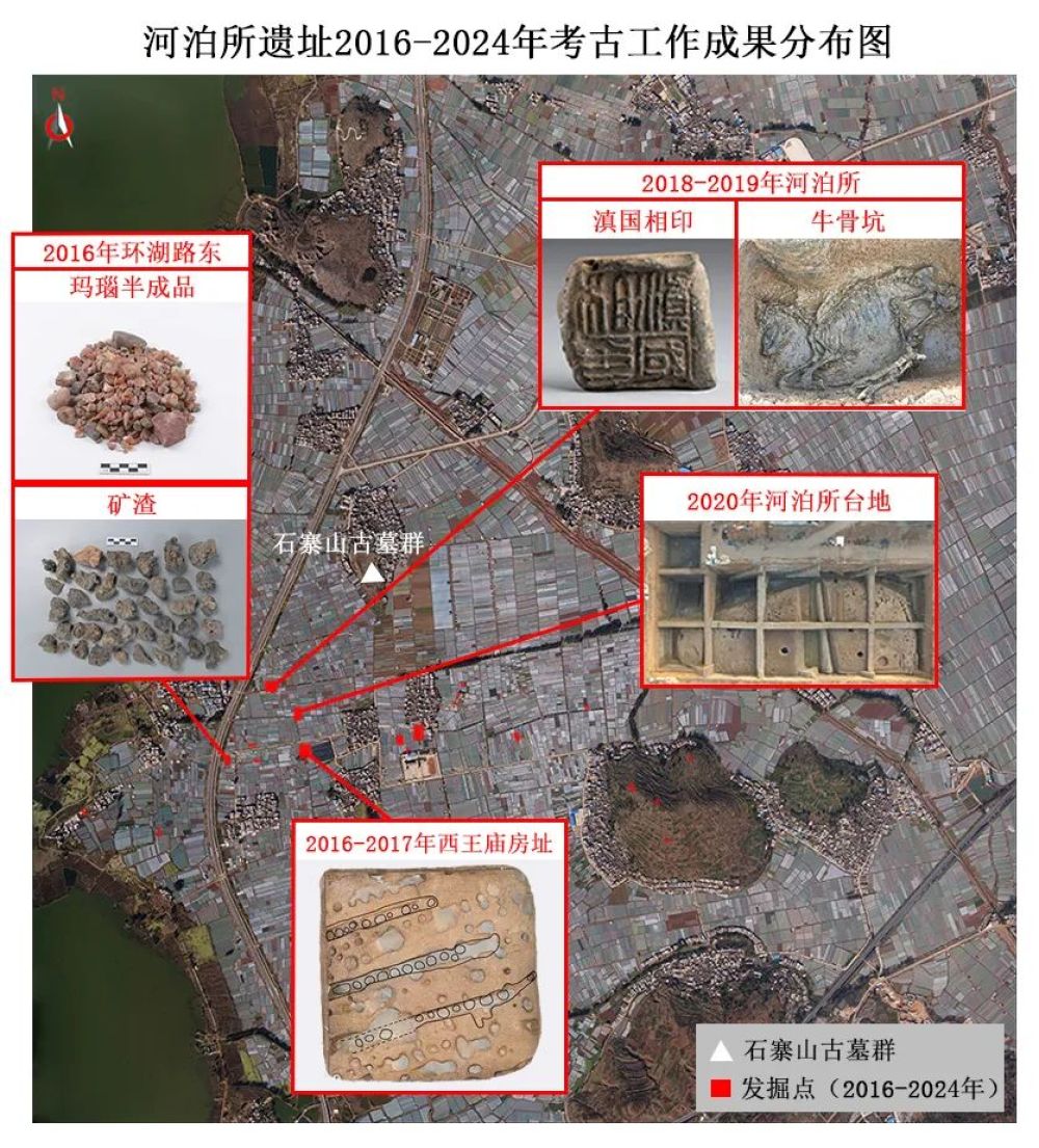 2008年,云南省文物考古研究所聯(lián)合國外高校,啟動了對滇池東南岸的系統(tǒng)性考古調(diào)查。此次調(diào)查共發(fā)現(xiàn)79處古滇文化及漢文化遺址,河泊所遺址是其中分布面積最大的一處,北距出土“滇王之印”的石寨山古墓群僅約一公里。