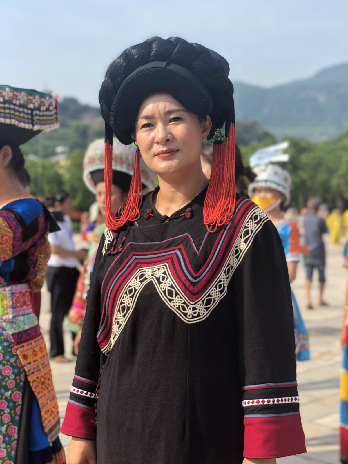 彝族服飾:男女皆穿右衽大襟衣,披擦爾瓦、披氈。婦女著百褶裙、戴頭帕。傳統(tǒng)衣料以自織自染的毛麻織品為主,傳統(tǒng)色彩為黑、紅、黃三色。圖案紋飾多為動植物和生活物品。