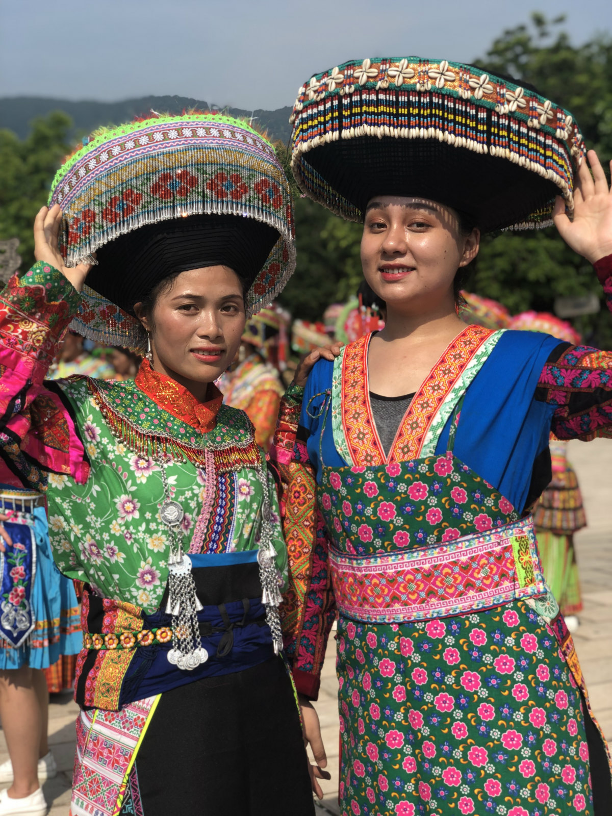苗族服飾:婦女穿窄袖、大領、對襟短衣、百褶裙。衣裙或長可抵足,或短不及膝。男子多為對襟短衣或右衽長衫,肩披織有幾何圖案的羊毛氈,頭纏青色包頭,小腿上纏裹綁腿。