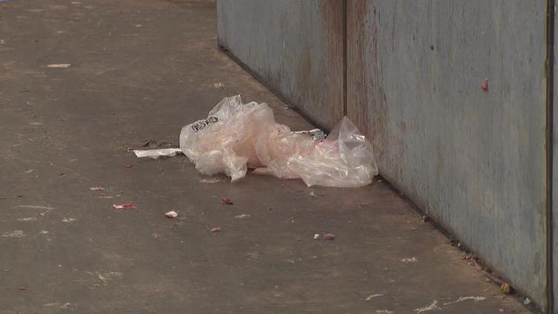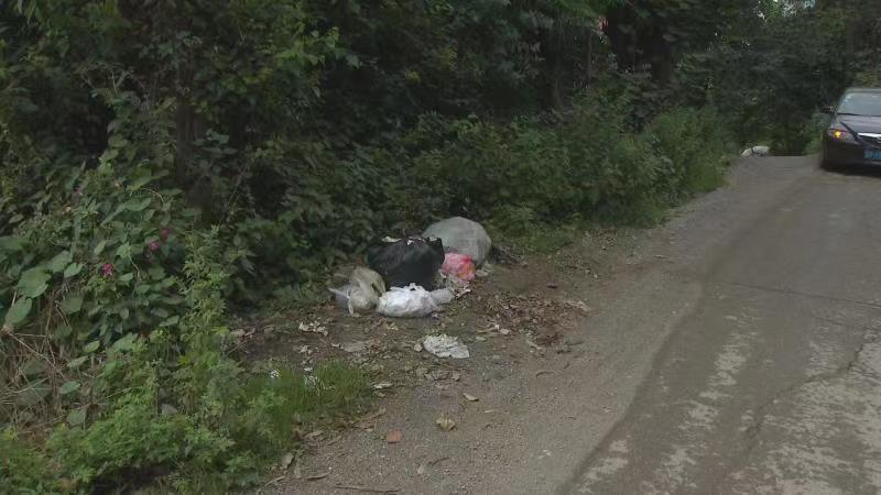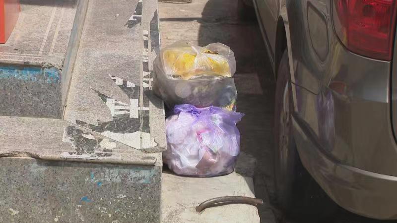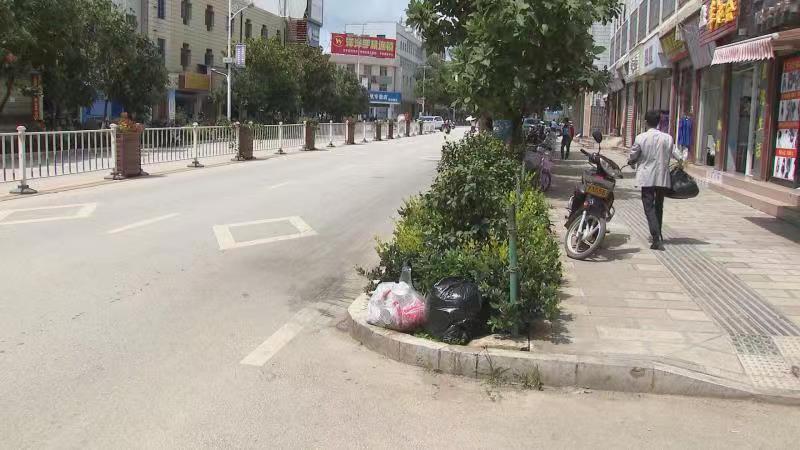 縣城臨街商鋪垃圾袋臨時堆放在綠化帶;