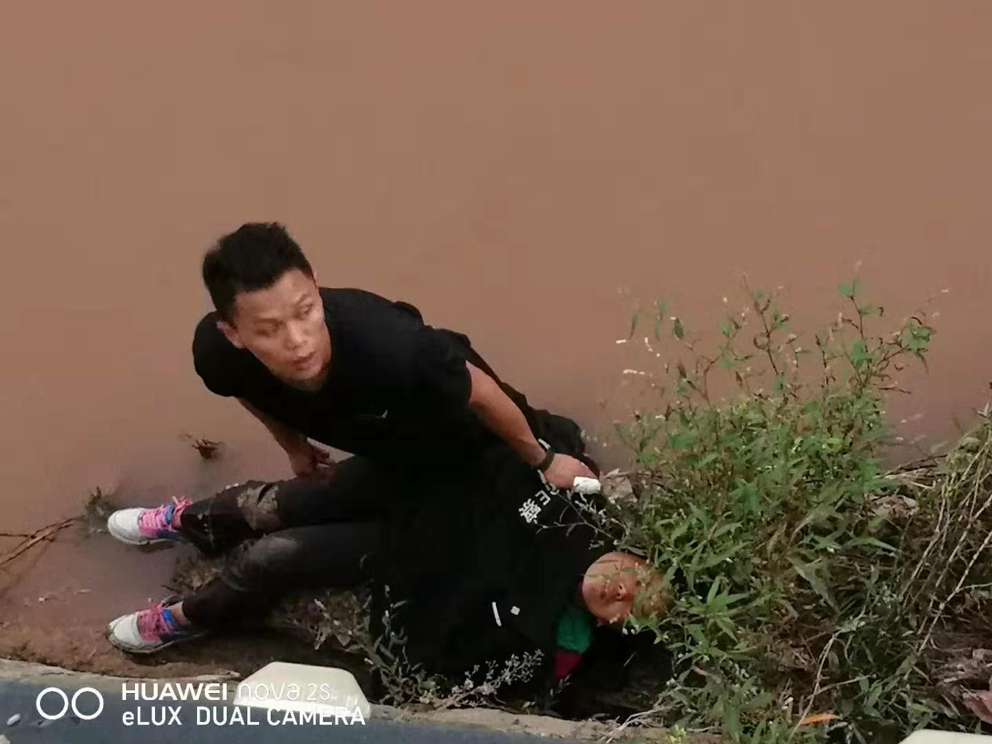 河堤距離水面將近6米多高,且沒有利于下水施救的地點。只能由民警拉著警戒棍一端讓水性較好的民警曹濤下河施救,曹濤順著警戒棍滑向河道底部,發(fā)現(xiàn)警戒棍距離河面還有2米左右。情況危急,來不及多想,曹濤立即跳入河內,其他民警迅速繞道進入河內進行救援。