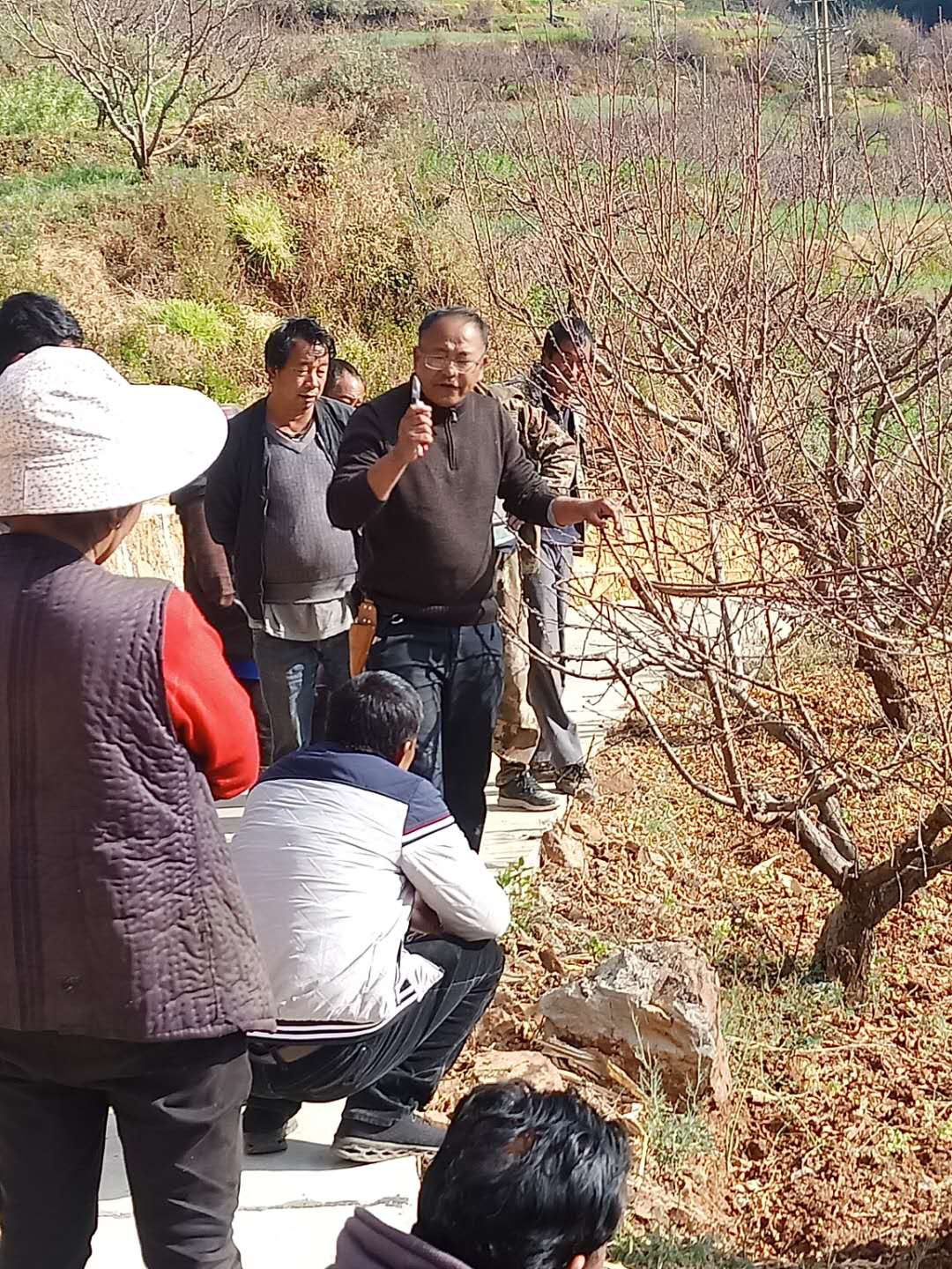 張福為三古村農(nóng)戶講解桃樹修剪施肥技術