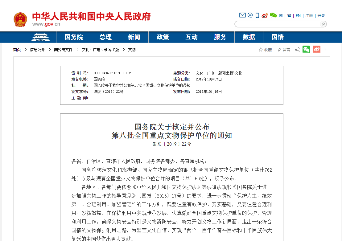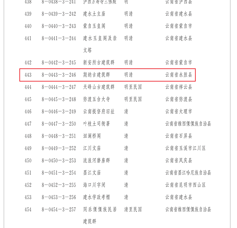 10月16日,中國政府網(wǎng)發(fā)布《國務(wù)院關(guān)于核定并公布第八批全國重點(diǎn)文物保護(hù)單位的通知》,公布了國務(wù)院核定文化和旅游部、國家文物局確定的第八批全國重點(diǎn)文物保護(hù)單位(共計(jì)762處)以及與現(xiàn)有全國重點(diǎn)文物保護(hù)單位合并的項(xiàng)目(共計(jì)50處),永勝縣期納古建筑群在其中。