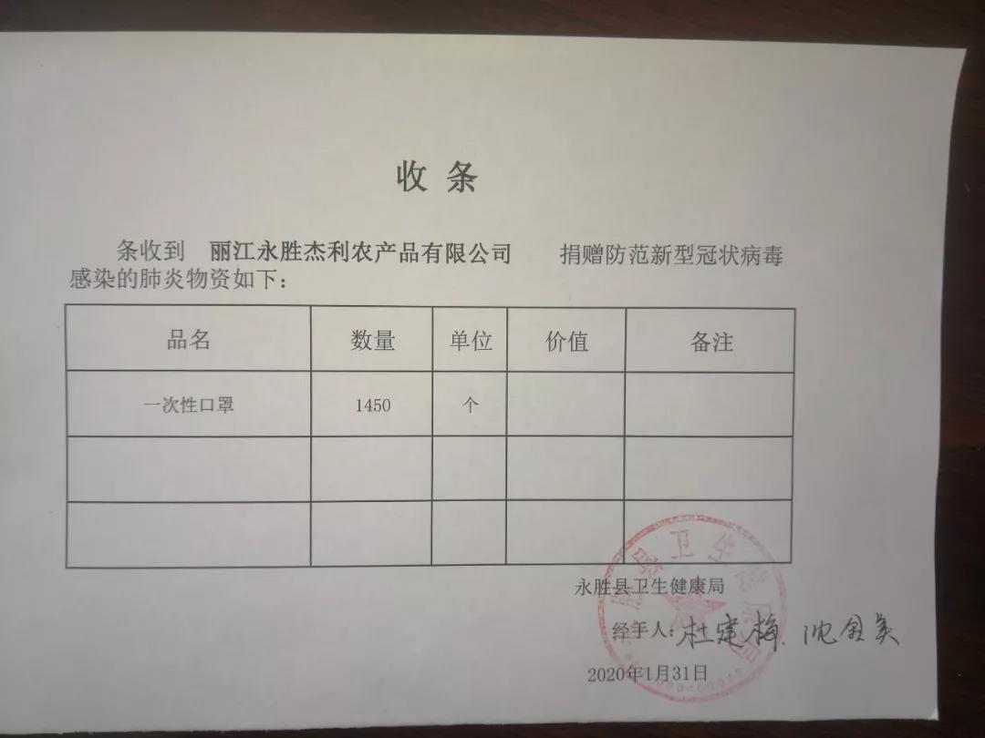 1月28日,在昆明經(jīng)營公司的永勝籍人士沙碧波為永勝縣衛(wèi)生健康局捐贈手持電子體溫計(jì)2臺。1月31日,麗江永勝杰利農(nóng)產(chǎn)品有限公司將庫存的1450個進(jìn)口一次性口罩,無償贈送給永勝縣新型冠狀病毒感染的肺炎疫情防控工作指揮部,紛紛以實(shí)際行動支持家鄉(xiāng)防疫工作。