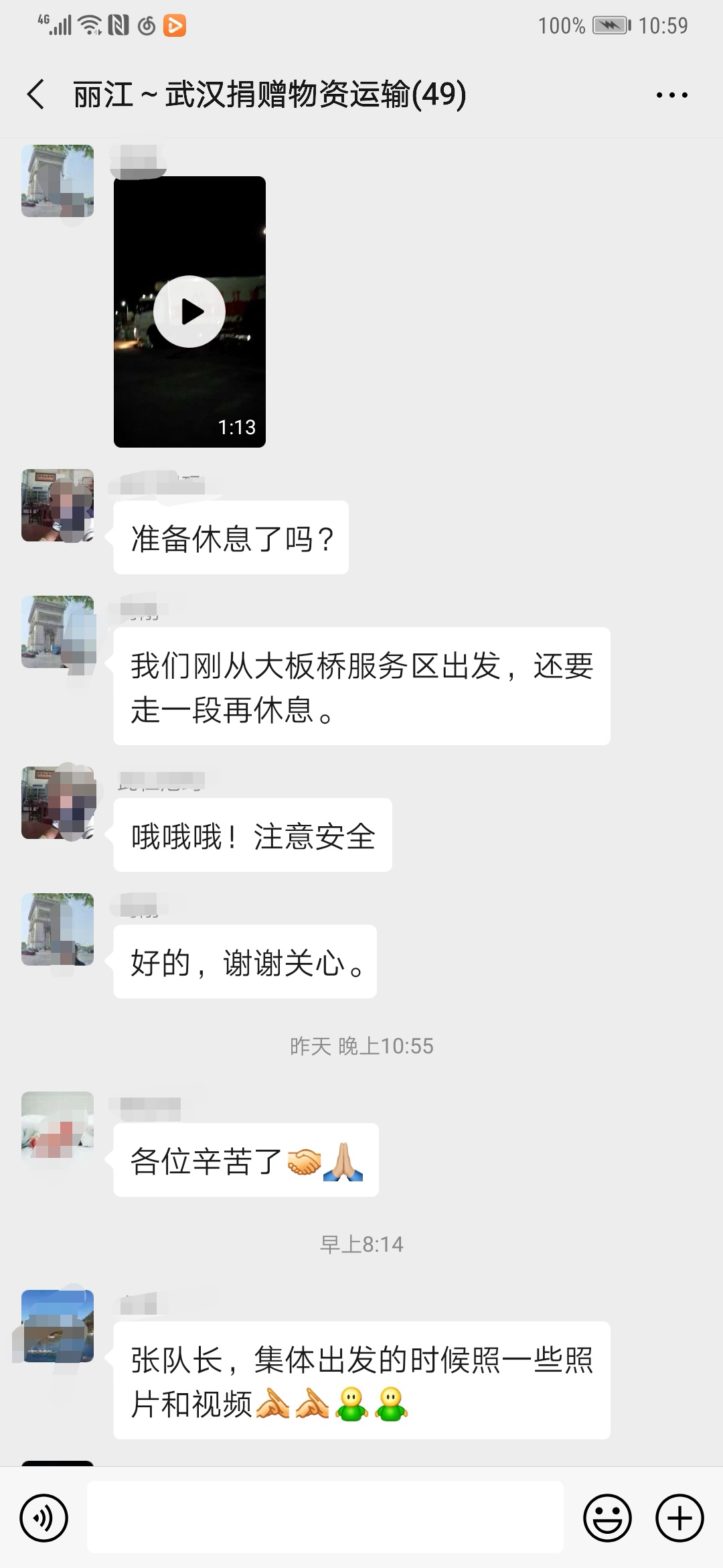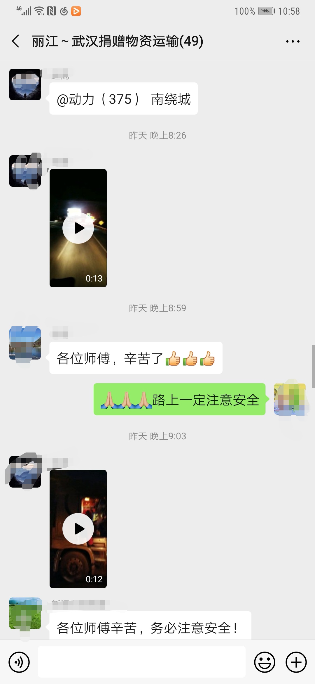 從昨天開(kāi)始,一個(gè)名叫“麗江~武漢捐贈(zèng)物資運(yùn)輸”的微信群十分活躍,除了師傅,麗江各家媒體記者也在微信群中,代表全市的人民時(shí)刻關(guān)注著師傅的動(dòng)向。“師傅你們到哪兒了?”“休息得好嗎?”“車隊(duì)匯合了嗎?”趁著師傅休息調(diào)整的空檔,大家紛紛隔著屏幕為師傅們加油打氣。