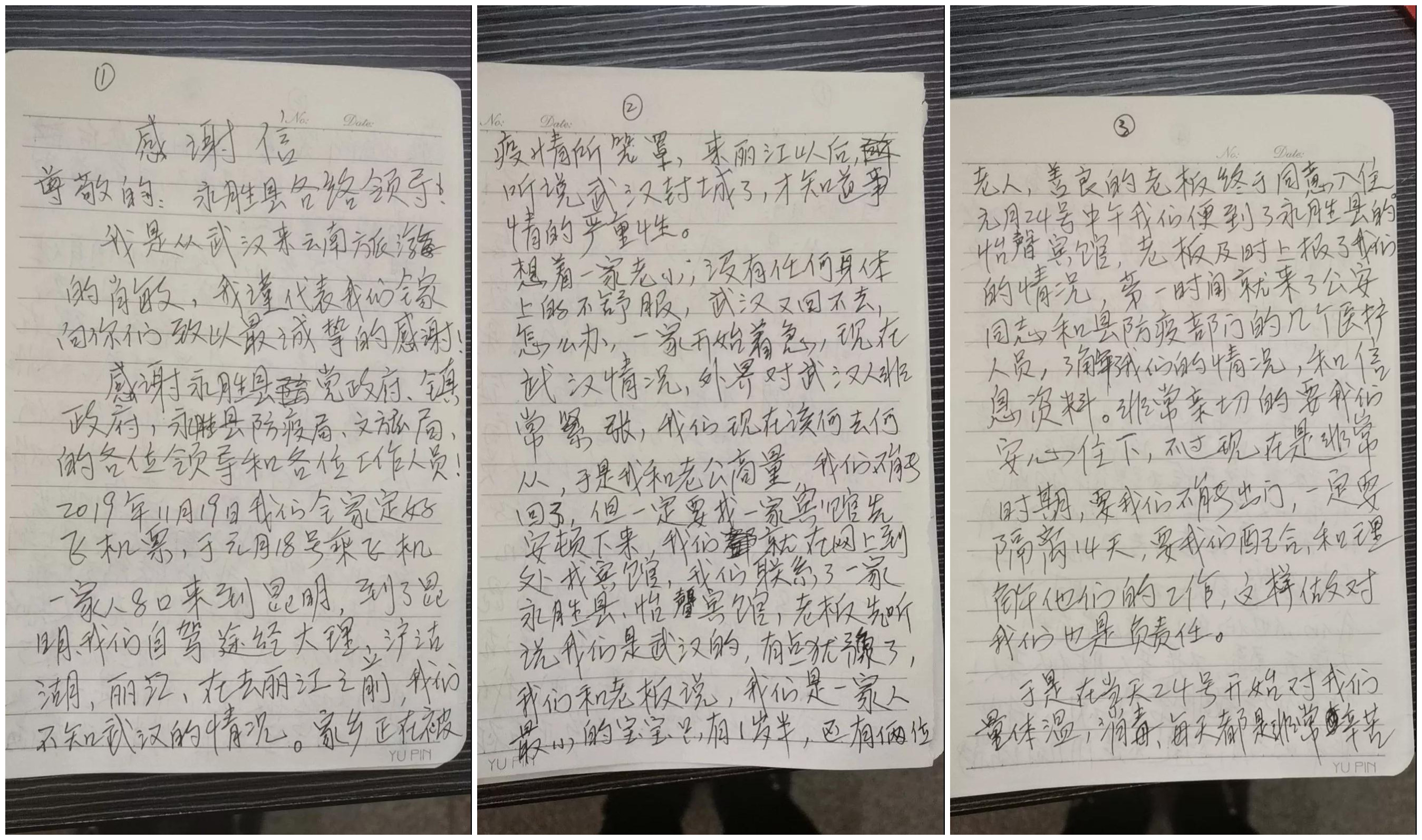 在一家人走投無(wú)路的時(shí)候,永勝縣縣城怡馨酒店的老板看著他們一家老小在除夕夜還在為落腳處發(fā)愁,便收留了他們。期間,永勝縣委縣政府領(lǐng)導(dǎo)前去慰問(wèn),永北鎮(zhèn)黨委政府安排專(zhuān)人為她家購(gòu)買(mǎi)生活物資,送上永勝土特產(chǎn),對(duì)她們噓寒問(wèn)暖。工作人員按留驗(yàn)觀察程序定時(shí)開(kāi)展監(jiān)測(cè)、消殺。感謝信雖然不長(zhǎng),但字里行間無(wú)一不流露出她一家人對(duì)永勝這座充滿(mǎn)愛(ài)的小城的感激之情。