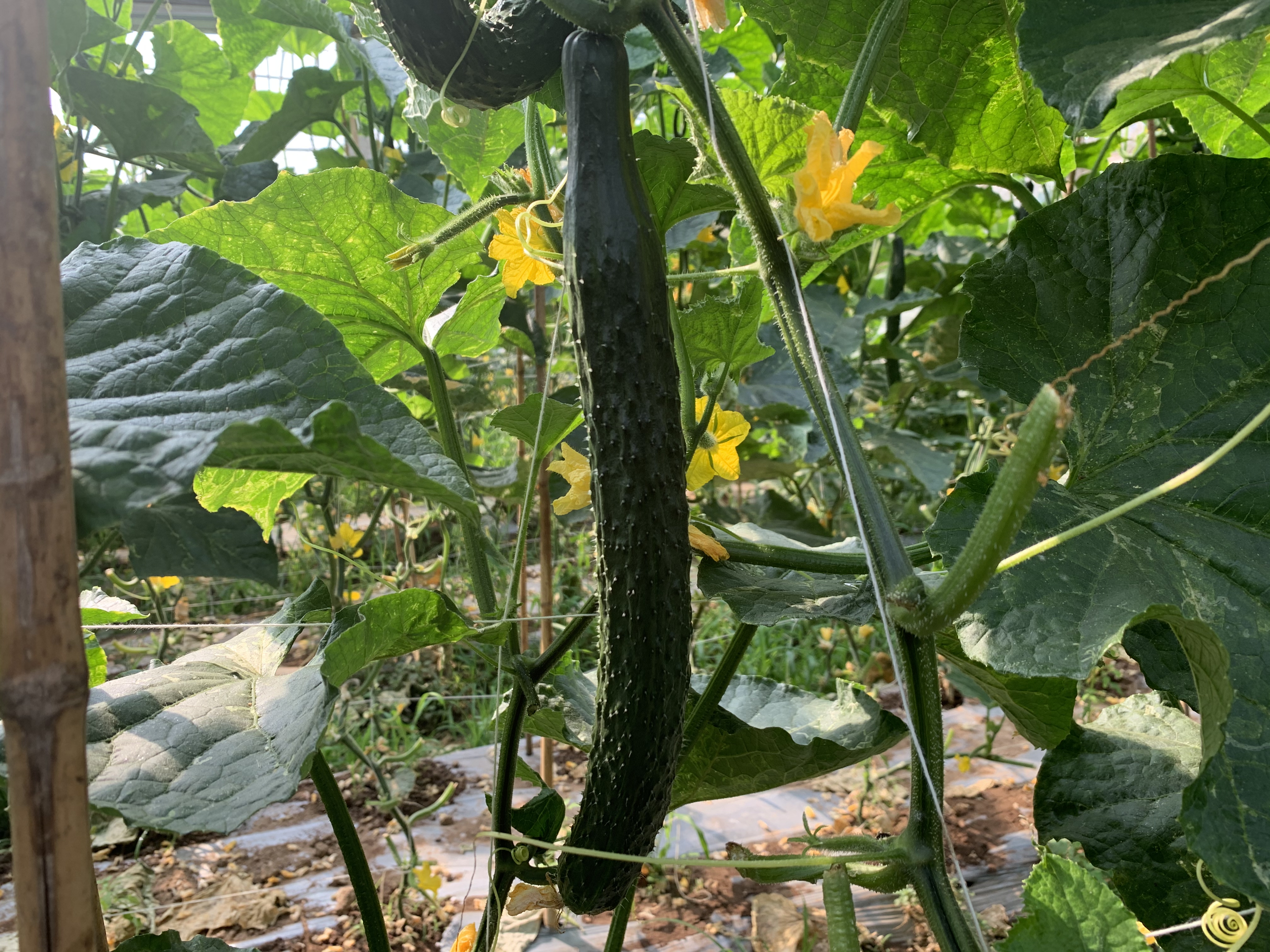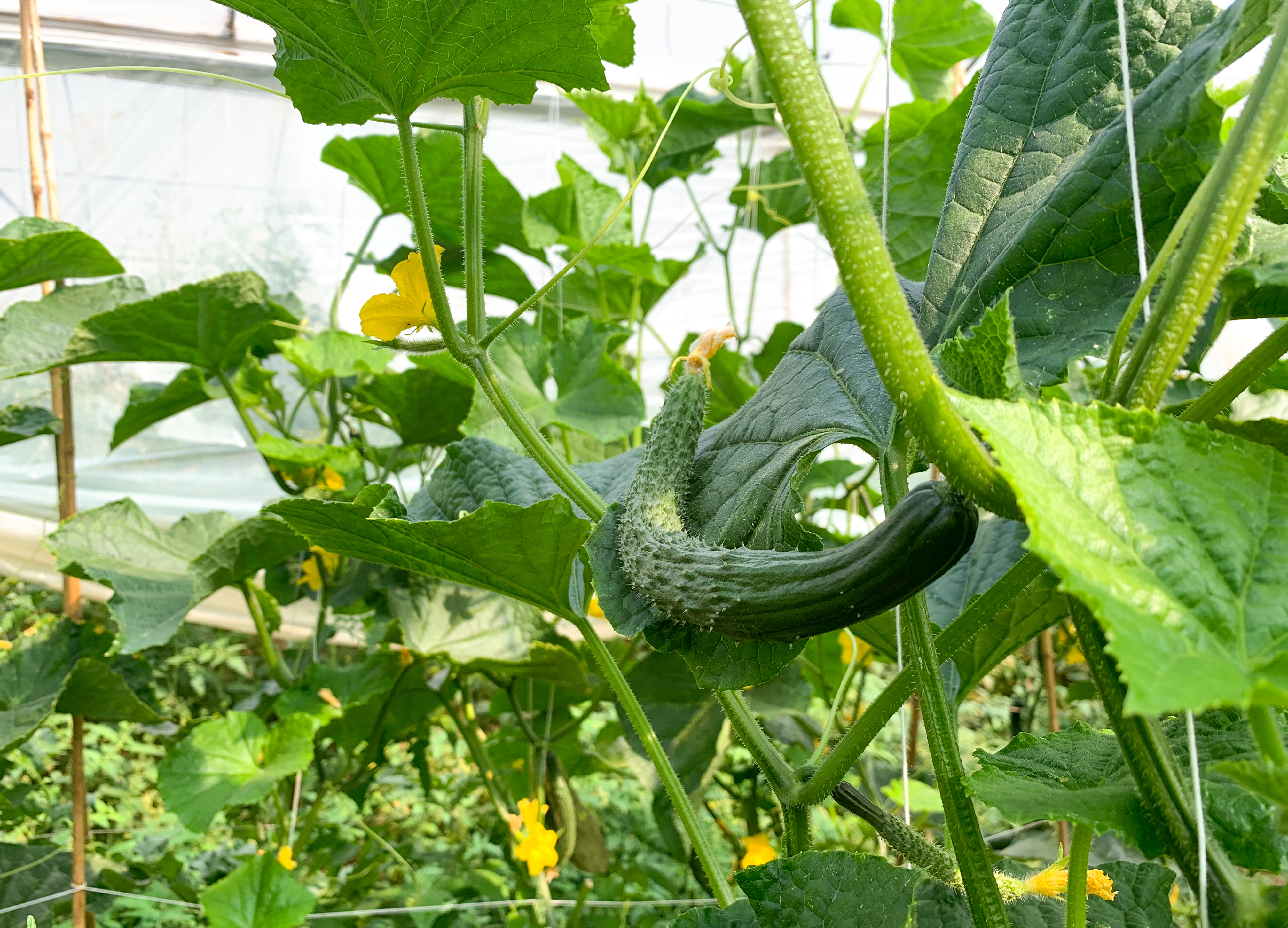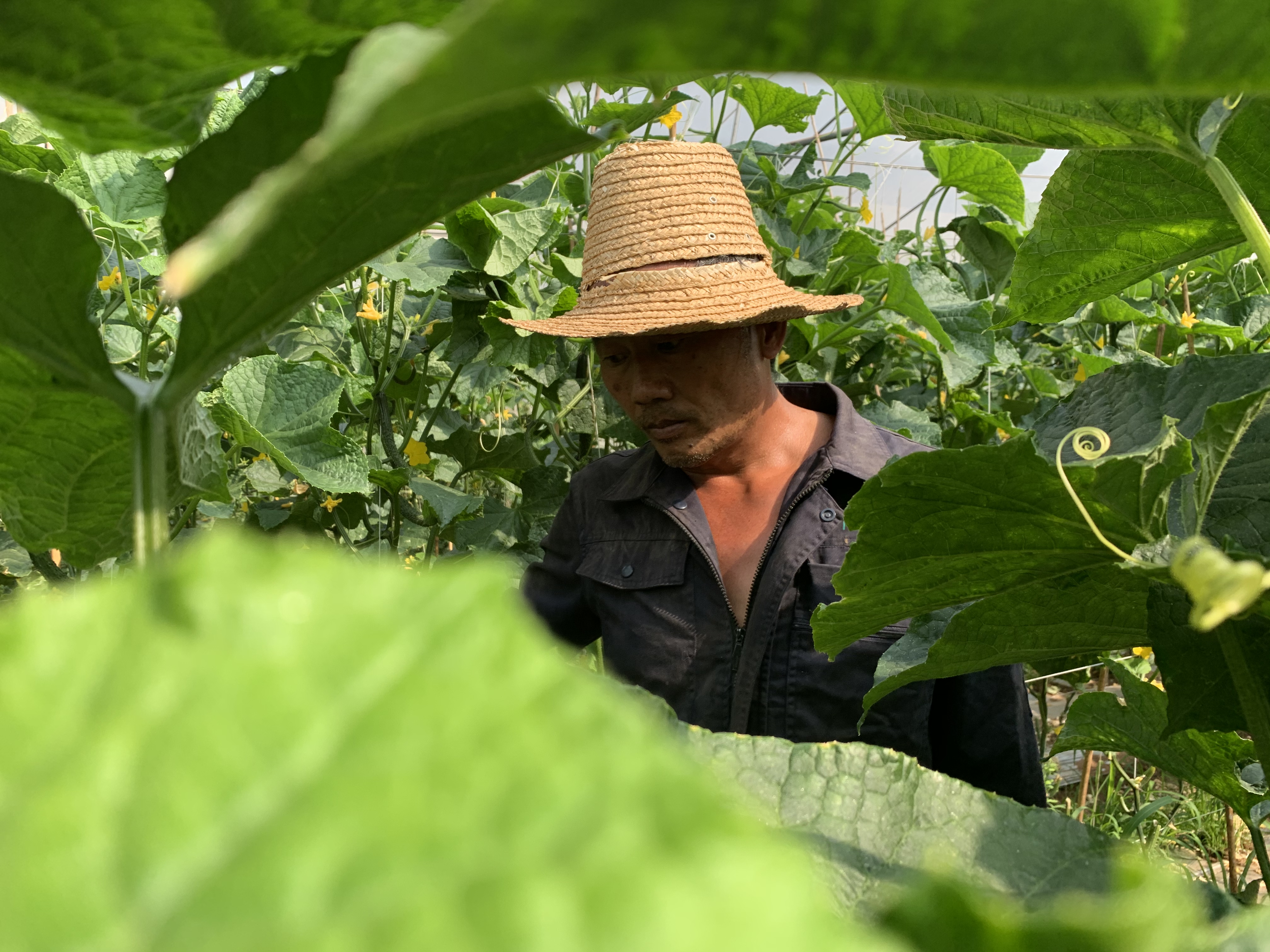 走進(jìn)另一個棚內(nèi),記者看到一米多高的架子上掛滿了一個個新鮮欲滴,等待采摘的小黃瓜。