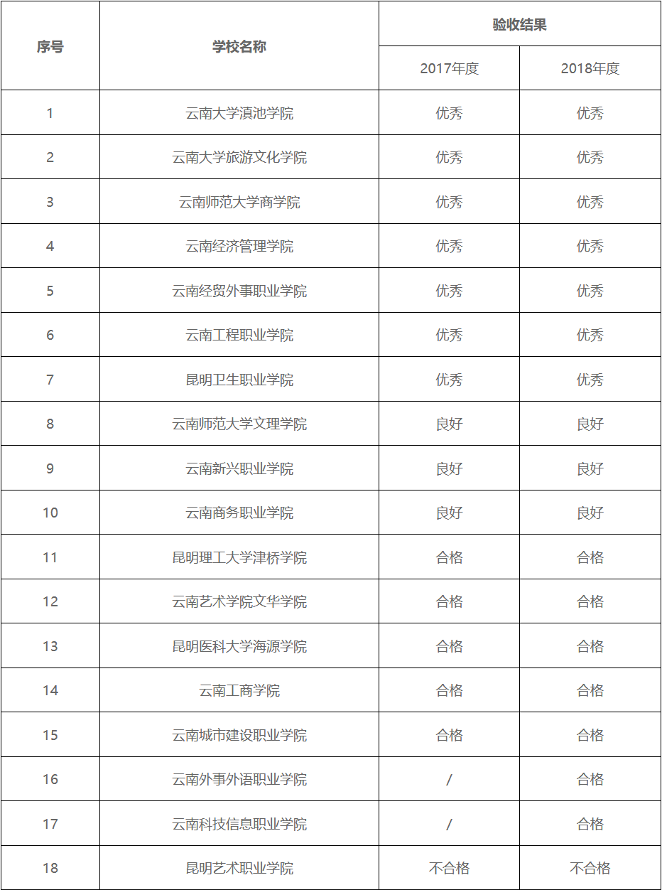 (注:1、云南外事外語職業(yè)學(xué)院、云南科技信息職業(yè)學(xué)院2017年度未獲得專項資金支持。2、云南三鑫職業(yè)學(xué)院因征地辦學(xué)過程中存在糾紛,項目尚未實施,不具備驗收條件,故未對該院進行驗收。)