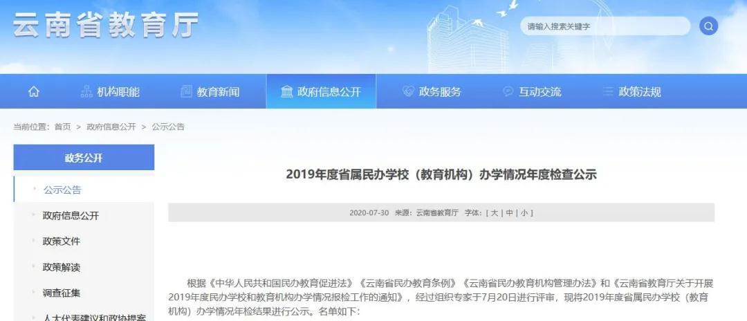 根據(jù)《中華人民共和國民辦教育促進法》《云南省民辦教育條例》《云南省民辦教育機構(gòu)管理辦法》和《云南省教育廳關(guān)于開展2019年度民辦學(xué)校和教育機構(gòu)辦學(xué)情況報檢工作的通知》,經(jīng)過組織專家于7月20日進行評審,現(xiàn)將2019年度省屬民辦學(xué)校(教育機構(gòu))辦學(xué)情況年檢結(jié)果進行公示。名單如下: