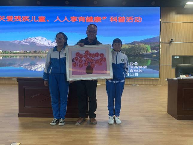 學(xué)生代表為麗江市聾人協(xié)會主席、麗江市民族醫(yī)藥協(xié)會會長劉建勤送上了親手制作的工藝品,表達(dá)濃濃的感謝之情。