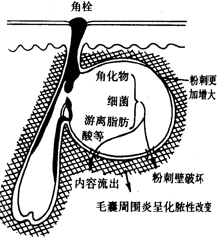 早期的痤瘡并無感染,皮脂內微生物分解甘油三脂形成游離脂肪酸,脂肪酸刺激毛囊產生非特異性炎癥反應,出現(xiàn)丘疹、膿皰、結節(jié)和膿腫。