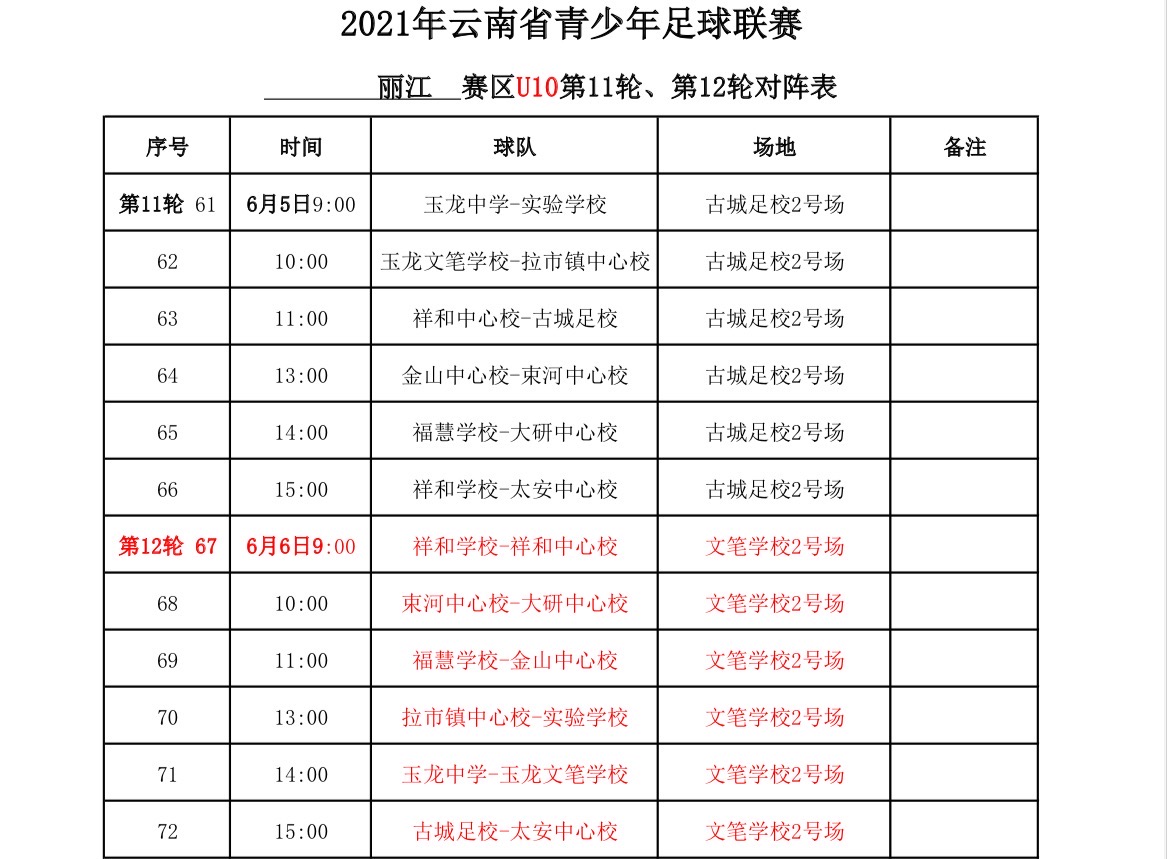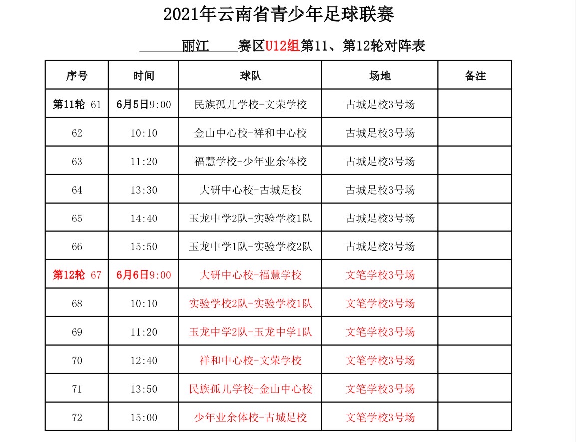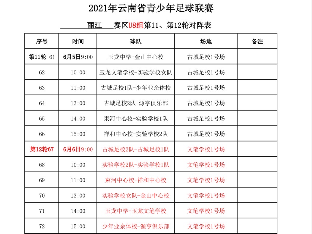 2021年“中國(guó)體育彩票”云南省青少年足球聯(lián)賽麗江賽區(qū)已于4月17日與昆明、曲靖、玉溪三個(gè)賽區(qū)同時(shí)開(kāi)賽。截至6月4日,第一階段麗江賽區(qū)第九、十輪比賽全部結(jié)束。第十一、十二輪比賽將在本周末(6月5、6日)分別在古城足校和文筆學(xué)校進(jìn)行。