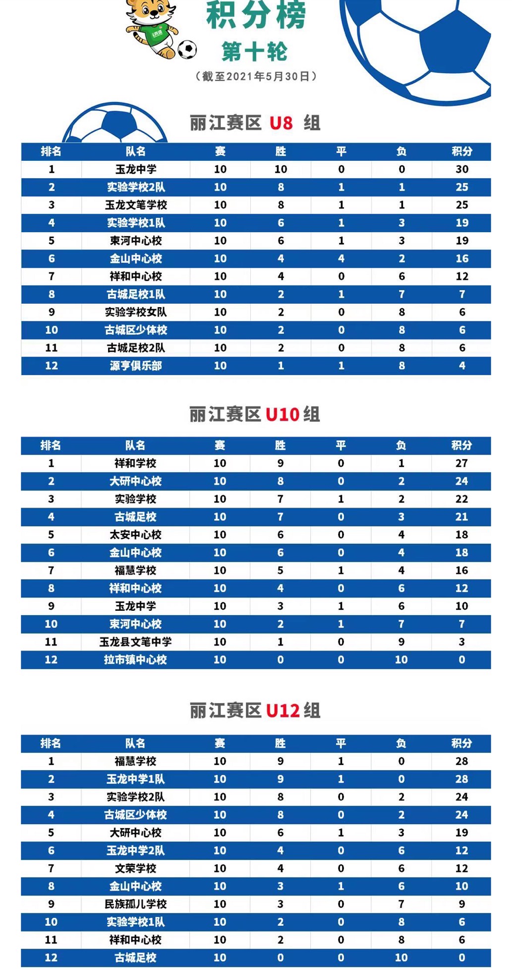 賽事積分榜顯示,目前玉龍中學(xué)以30分的積分位于U8組榜首,祥和中學(xué)以27分積分位于U10組榜首,?;蹖W(xué)校以28分的積分位于U12組榜首。