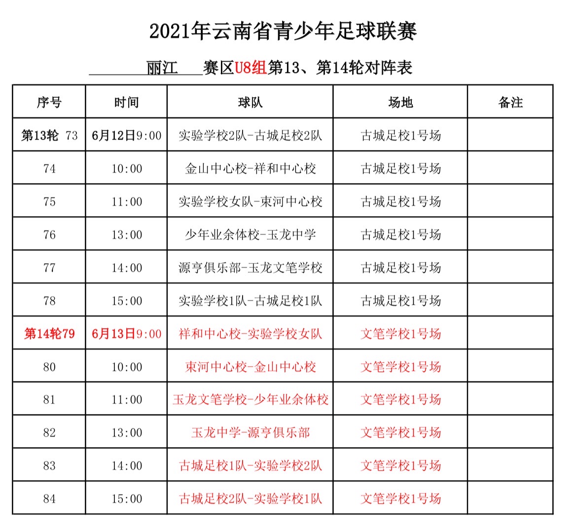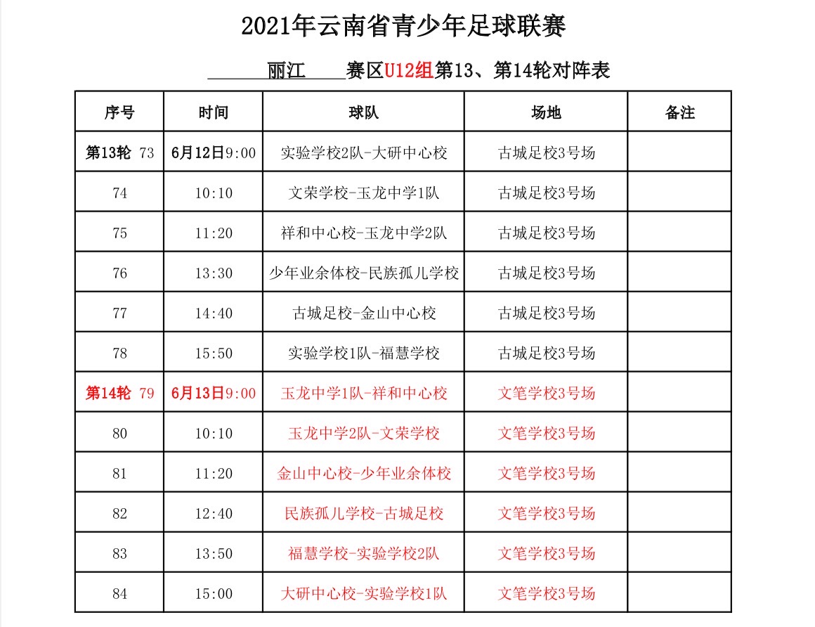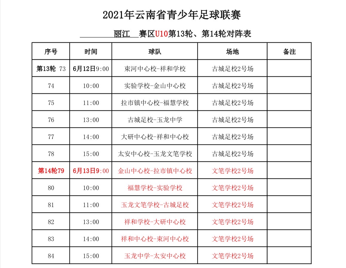 2021年“中國體育彩票”云南省青少年足球聯(lián)賽麗江賽區(qū)已于4月17日與昆明、曲靖、玉溪三個賽區(qū)同時開賽。截至6月11日,“中國體育彩票”2021云南省青少年足球聯(lián)賽第一階段麗江賽區(qū)第十一、十二輪比賽全部結(jié)束。第十三、第十四輪比賽將在本周末(6月12、13日)分別在古城足校和文筆學(xué)校進(jìn)行。