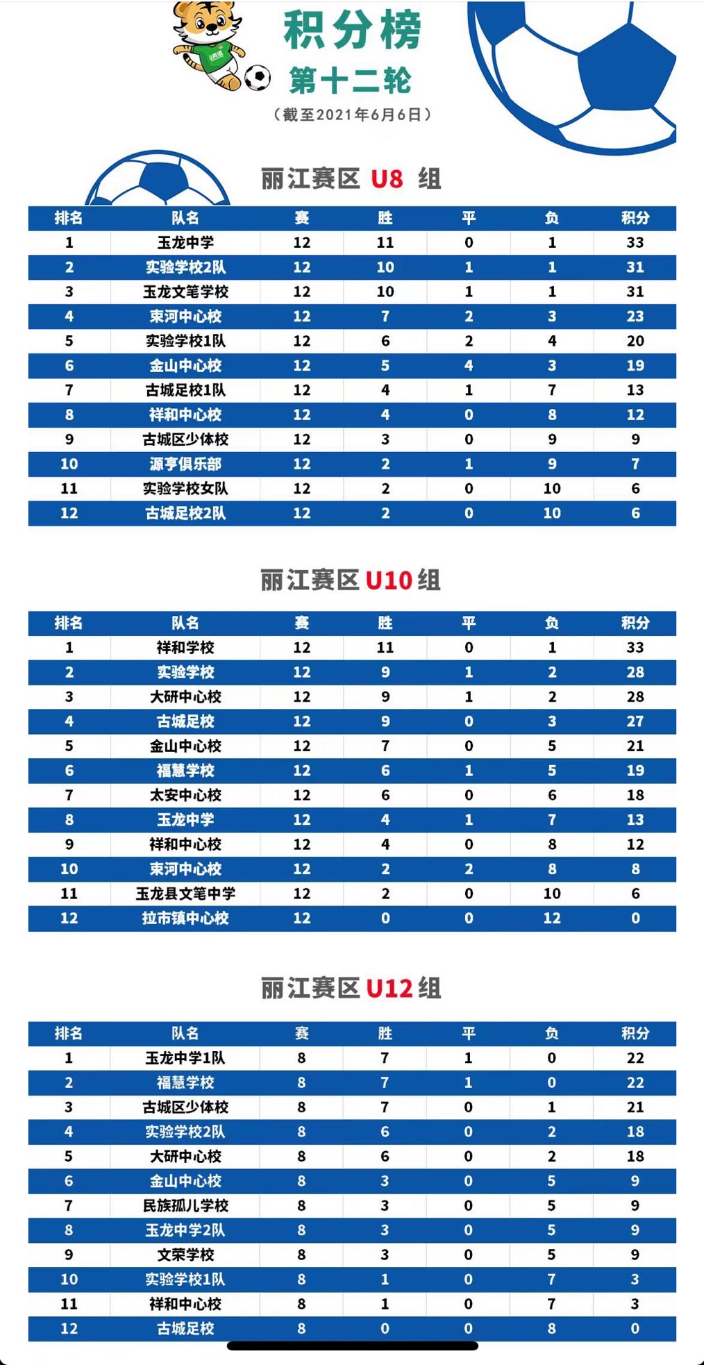 賽事積分榜顯示,目前玉龍中學(xué)以33分的積分位于U8組榜首,祥和學(xué)校以33分積分位于U10組榜首,玉龍中學(xué)1隊(duì)以22分的積分位于U12組榜首。