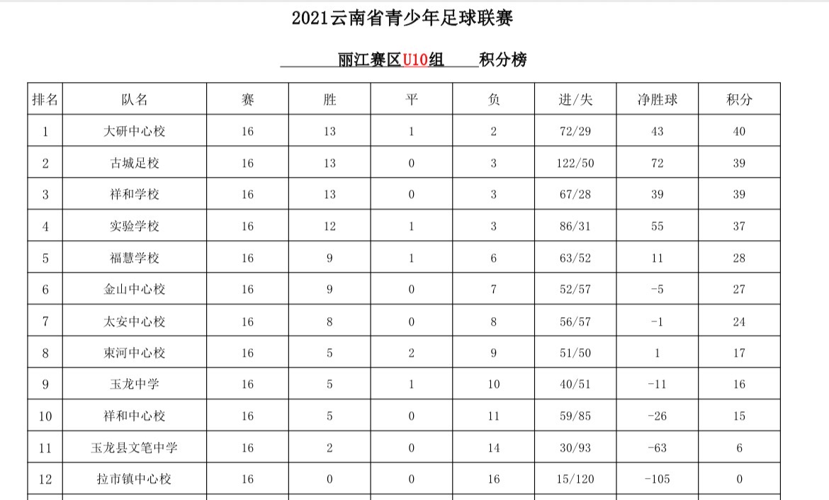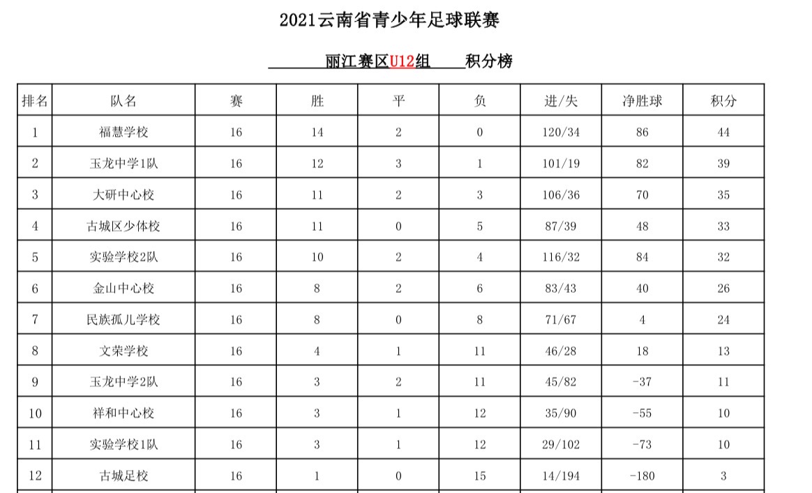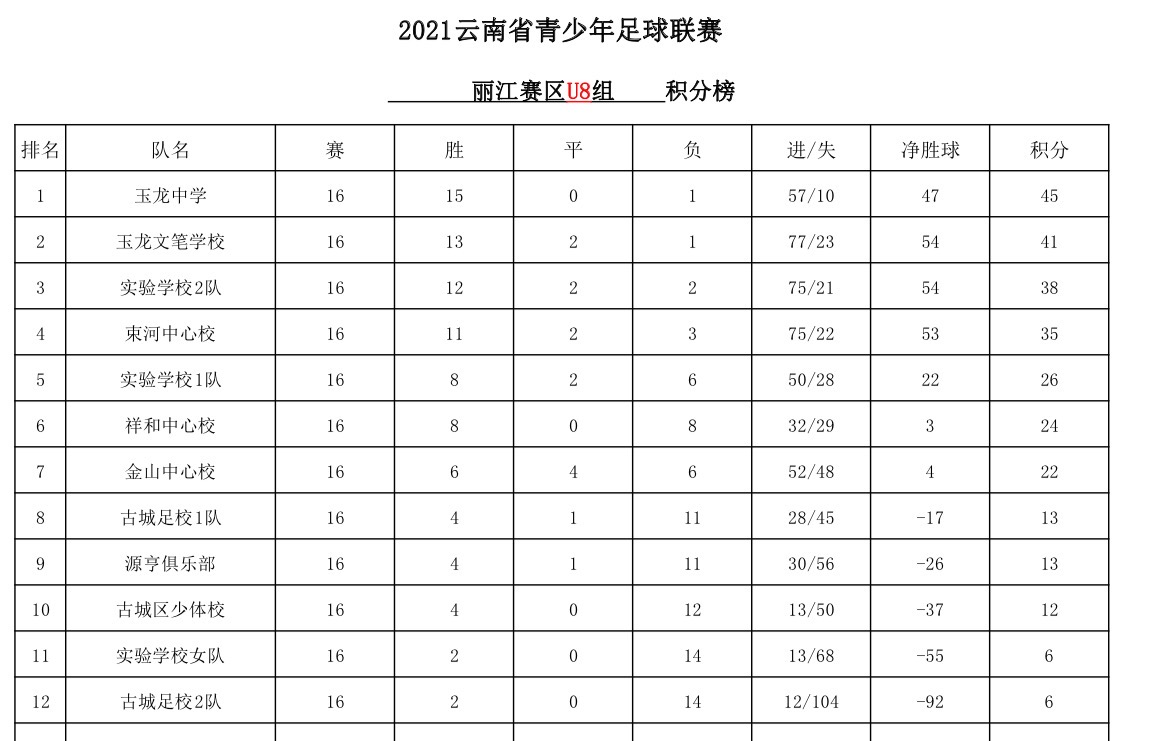 云南省青少年足球聯(lián)賽(麗江賽區(qū))第十五、十六輪比賽已完成,從積分榜看出,目前玉龍中學(xué)以45分的積分位于U8組榜首,大研中心校以40分積分位于U10組榜首,?;蹖W(xué)校以44分的積分位于U12組榜首。
