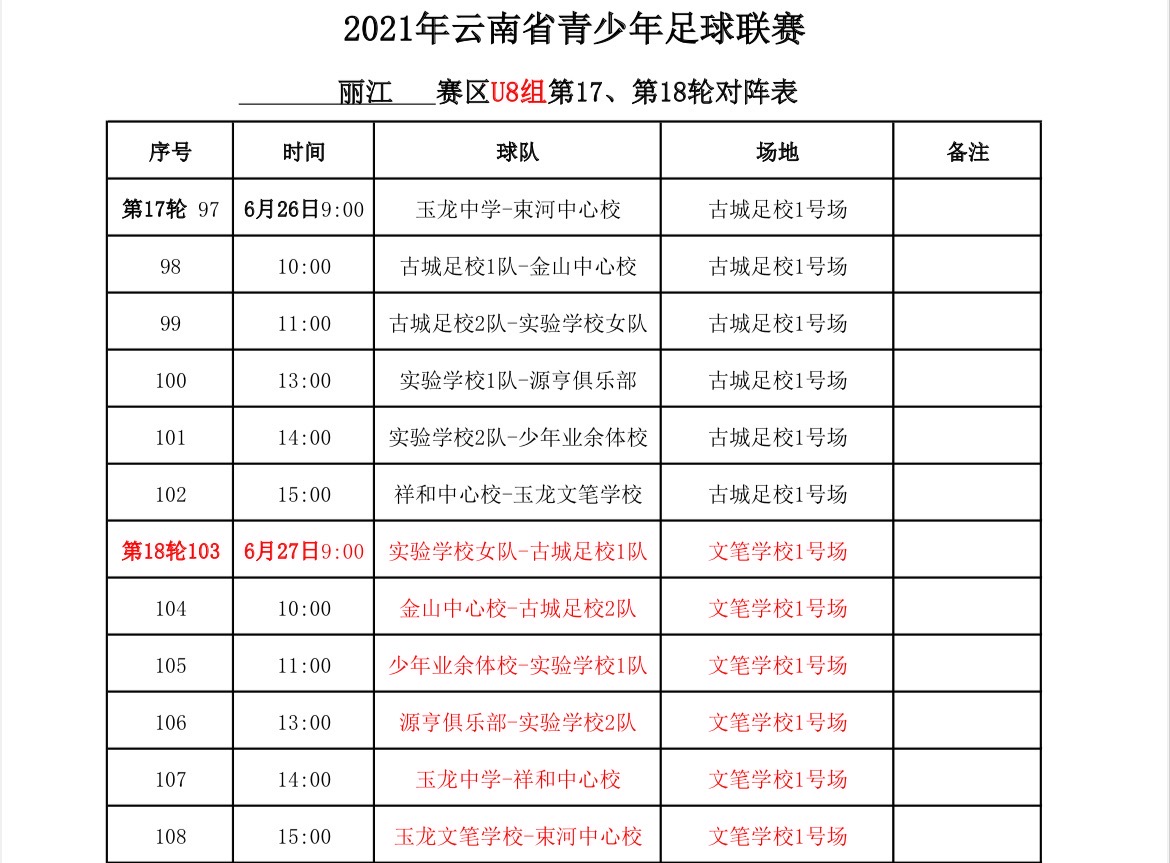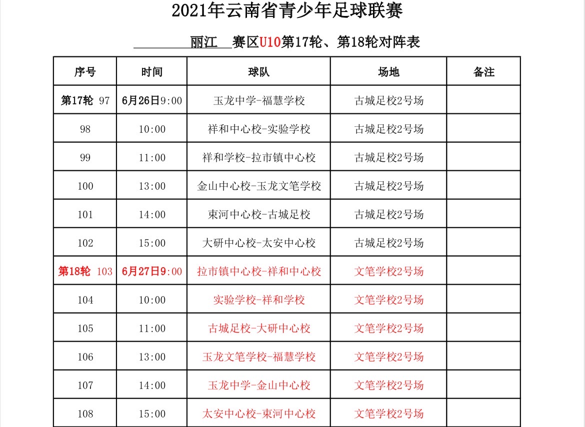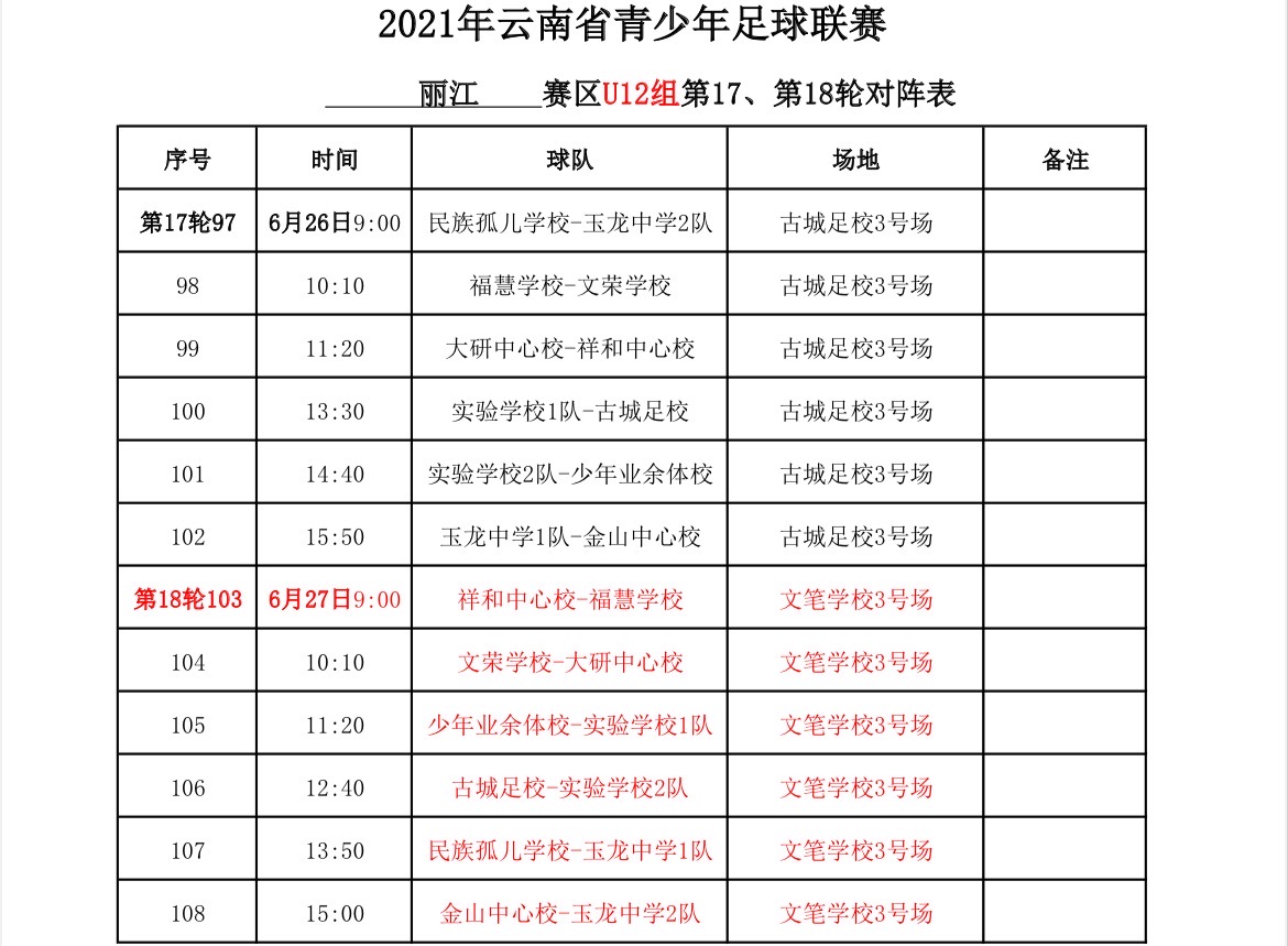 本周末(6月26號(hào)、27號(hào)),云南省青少年足球聯(lián)賽麗江賽區(qū)第十七、十八輪比賽將在文筆學(xué)校和古城足校舉行。