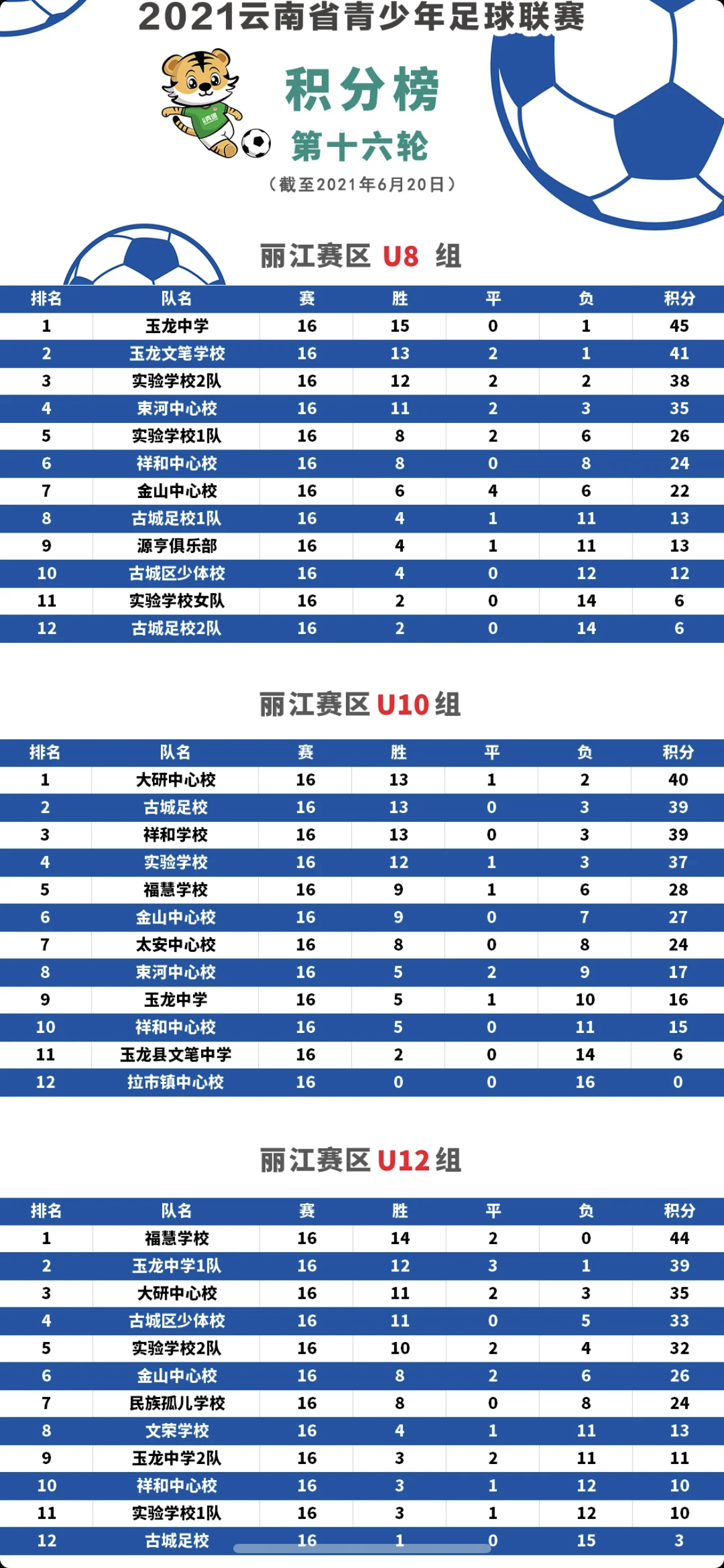 據(jù)悉,云南省青少年足球聯(lián)賽麗江賽區(qū)第十五、十六輪比賽已完成。積分榜顯示,目前玉龍中學(xué)以45分的積分位于U8組榜首,大研中心校以40分積分位于U10組榜首,?;蹖W(xué)校以44分的積分位于U12組榜首。
