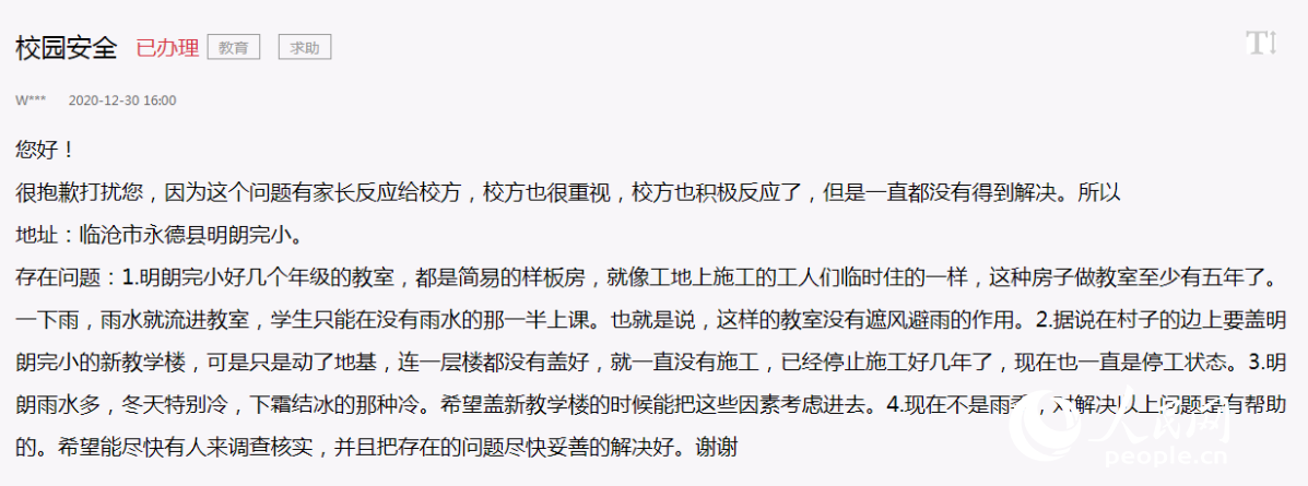 2020年12月30日,出于對孩子就學環(huán)境的憂慮,思忖再三的王鳳嬌,將明朗完小臨時教室的安全問題寫在了人民網(wǎng)“領導留言板”上。