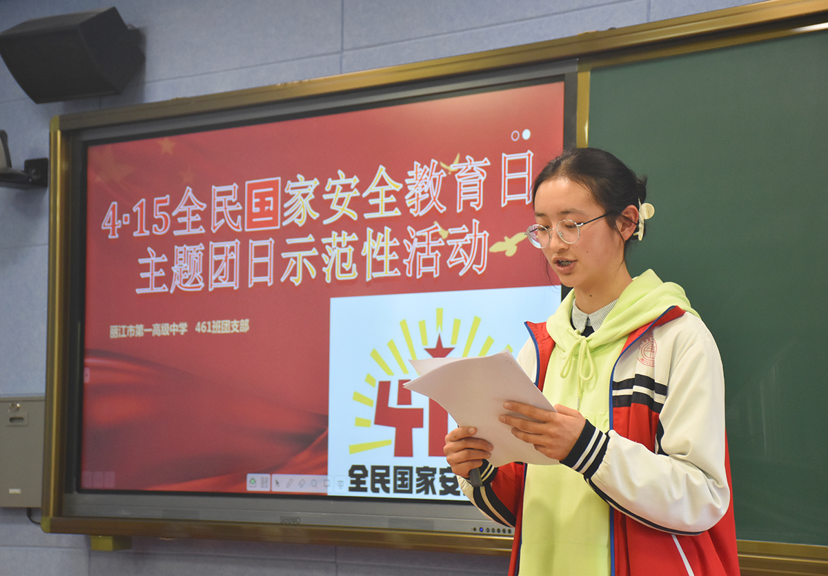 今天,在麗江市第一高級中學(xué)461班舉辦的“4·15” 全民國家安全教育日主題團(tuán)日活動就是此次活動內(nèi)容之一。學(xué)生們通過觀看“4·15”國家安全日宣傳教育短片、參加國家安全知識競賽、發(fā)言討論、舉行誓詞等內(nèi)容,進(jìn)一步加深了對國家安全的理解和認(rèn)識。