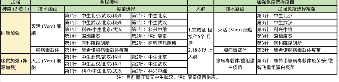 目前可選擇安徽智飛龍科馬公司的新冠病毒重組蛋白疫苗和天津康希諾公司的新冠病毒腺病毒載體疫苗中的一種,開展1劑次序貫加強免疫接種。