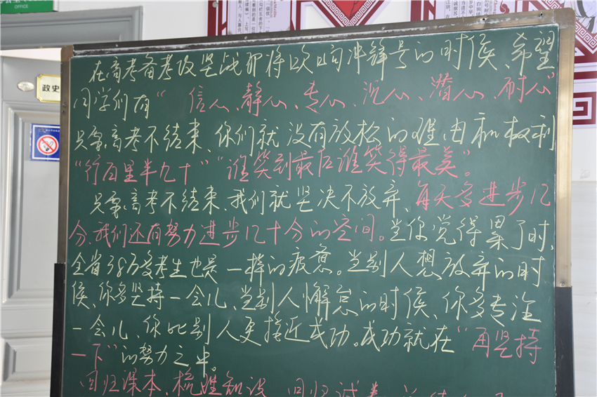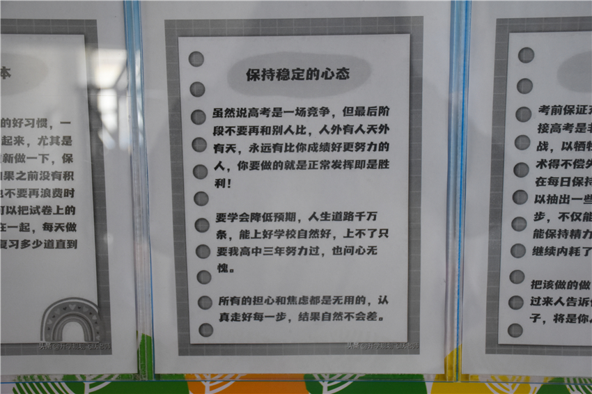“堅(jiān)持到底、永不放棄!”在古城區(qū)一中高三班級(jí)內(nèi),班長(zhǎng)帶領(lǐng)同學(xué)們大聲地喊著加油的口號(hào)。記者了解到,這是高三年級(jí)一種獨(dú)有的泄壓方式,不僅釋放了壓力,而且振奮人心。教室周圍也粘貼著如何釋放壓力等心理健康小貼士。