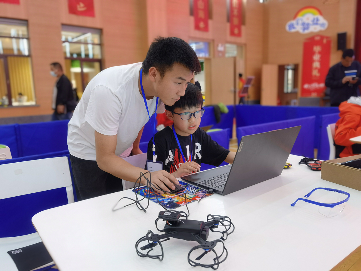 比賽現(xiàn)場(chǎng),青少年選手們?nèi)褙炞⒌夭倏刂鵁o人機(jī),在他們的熟練操作下,無人機(jī)或華麗轉(zhuǎn)身,或懸空而?!詈蠓€(wěn)穩(wěn)地降落在指定區(qū)域,完成了一場(chǎng)場(chǎng)精彩的編程空中搜尋賽。