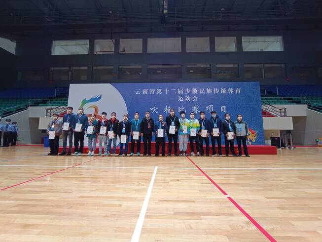 吹槍賽場上,男子吹槍15米雙輪跪姿決賽中,紅河小將三福林,與來自文山的羅洪福、羅洪明再次登場。