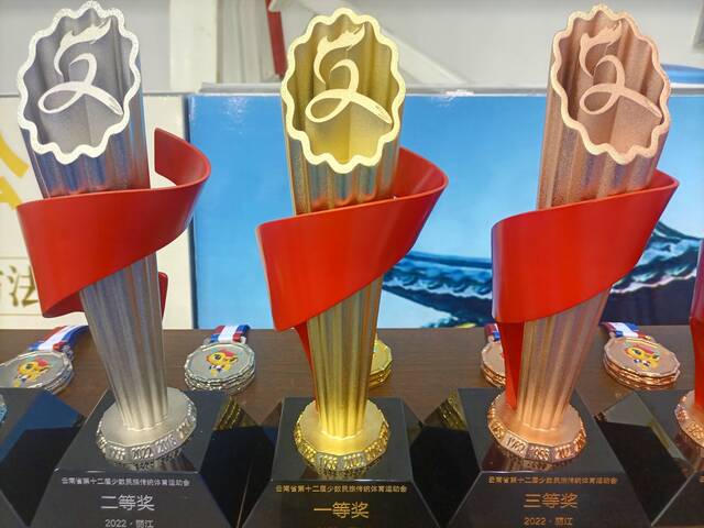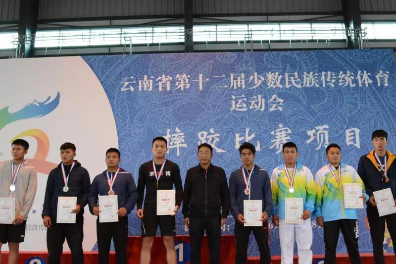 民族式摔跤格(彝族式摔跤)74KG+由麗江代表隊的斯日吉嘎瓦奪得冠軍,第二三名分別由昭通代表隊的錢澳和楚雄代表隊的王喬紅獲得;