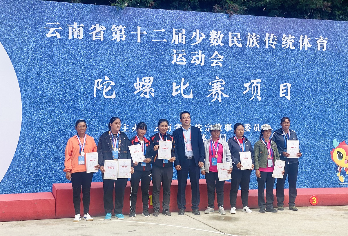 在陀螺女子單打比賽中,來自普洱的梅朝喜獲得第一名,來自楚雄的普琴珍獲得第二名,來自臨滄的李萍獲得第三名。