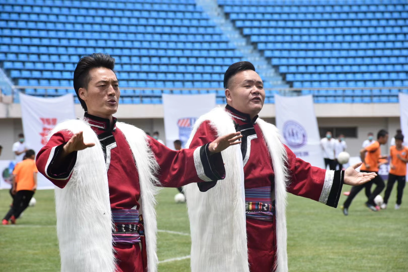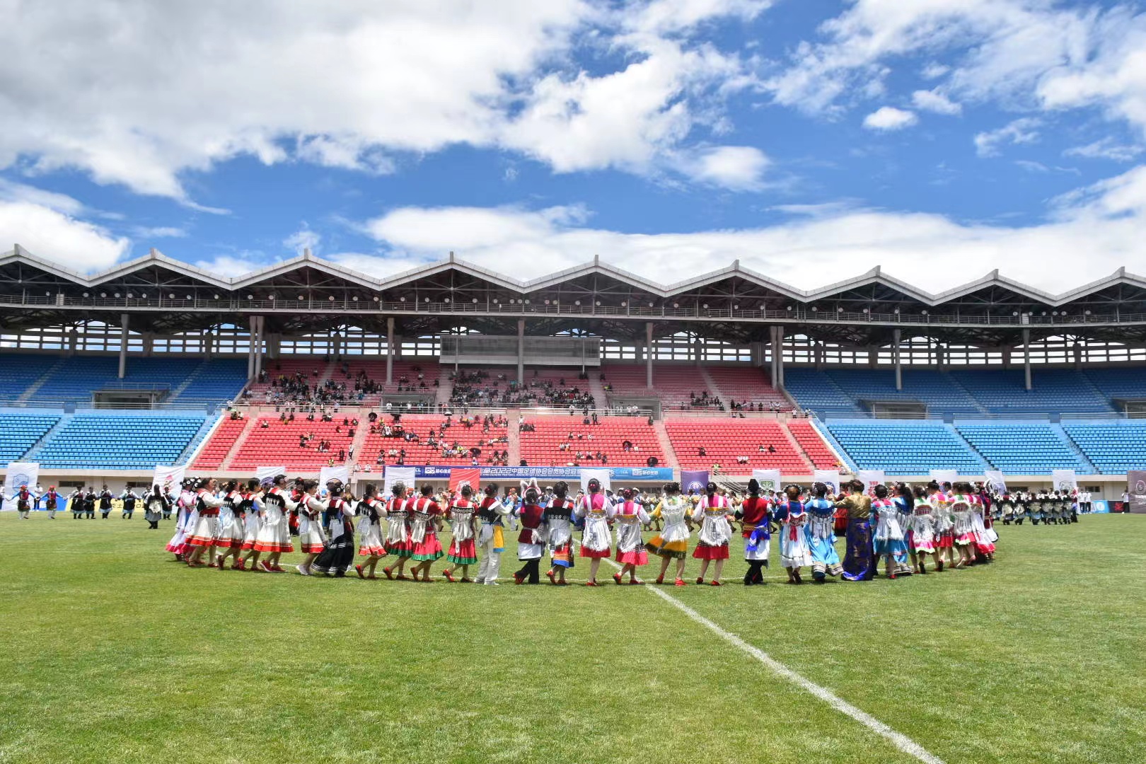 隨后,玉龍山組合及麗江源亨足球俱樂部隊員聯合演唱了麗江足球之歌——《我們是勇敢的雪山雄鷹》;由200人組成的表演團隊帶來了云南特色傳統(tǒng)民族打跳《麗江三部曲》的歌舞表演,將開幕式現場推向高潮。