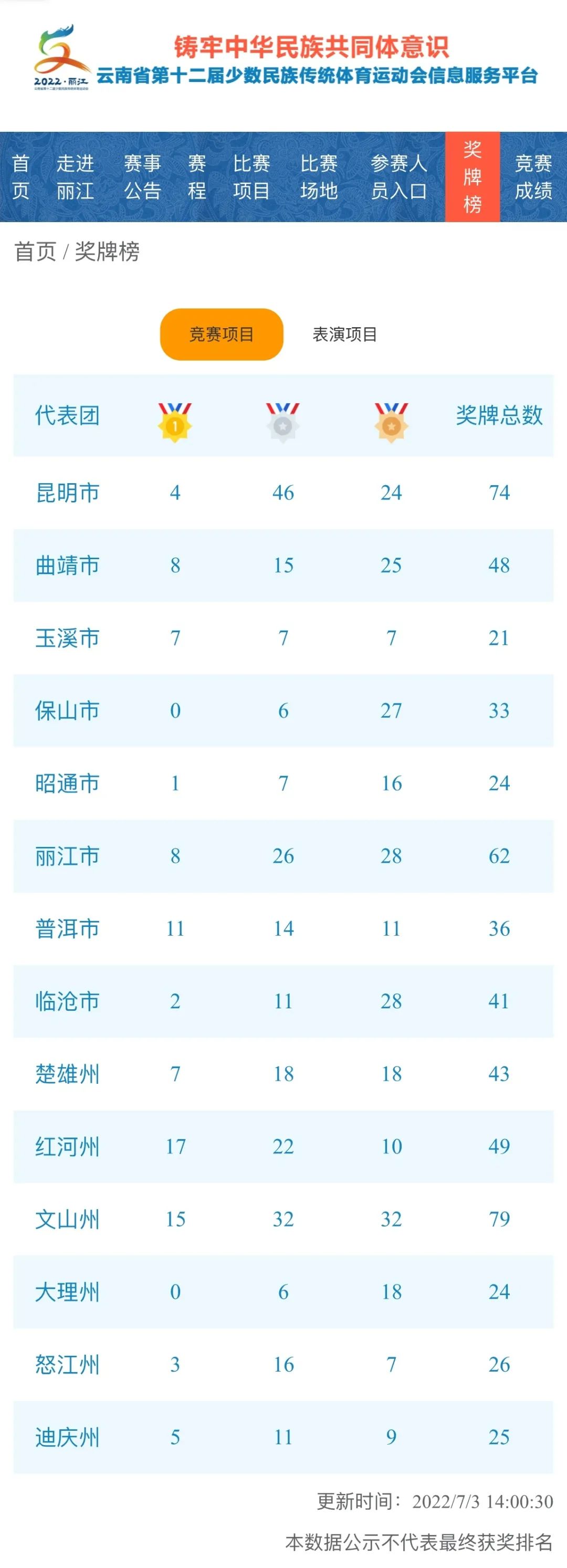 目前,云南省第十二屆少數(shù)民族傳統(tǒng)體育運動會在緊張、熱烈的氣氛中圓滿結(jié)束了兩個階段共10個項目的賽事。經(jīng)過運動員們激烈地角逐,各代表隊獲得獎牌數(shù)情況如何?跟著麗江熱線記者去看看!