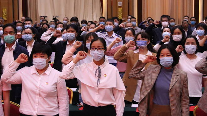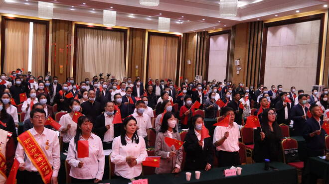 黨課最后,全體黨員再次齊聲對著黨旗宣誓,并高唱歌曲《沒有共產(chǎn)黨就沒有新中國》。