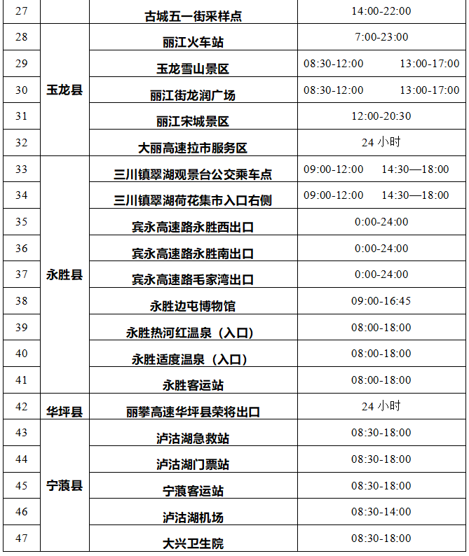 此外,記者了解到,古城區(qū)免費核酸采樣點中,古城景區(qū)水車入口、古城景區(qū)白龍廣場入口、麗江市體育館采樣點服務(wù)時間到21:00,古城景區(qū)北門坡入口、束河古鎮(zhèn)景區(qū)南門、束河街道哈里谷、束河街道金茂古鎮(zhèn)、束河街道黃山完小、古城五一街采樣點服務(wù)時間到22:00,玉龍縣免費核酸采樣點中麗江火車站采樣點服務(wù)時間到23:00。
