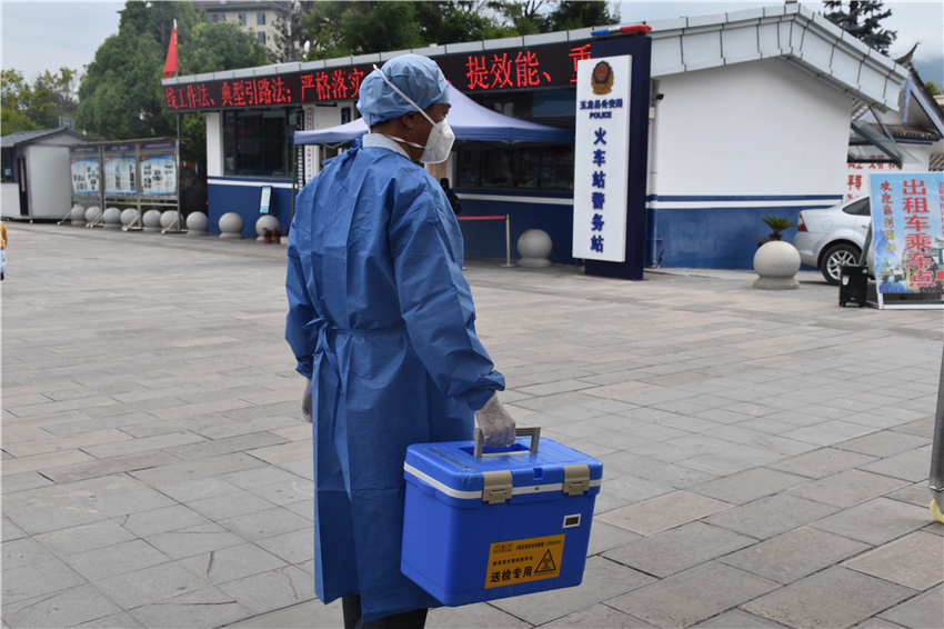 麗江火車站核酸采樣點工作人員共有8個小組,每組各配一名信息員、一名采樣員,樣本采集人員均經(jīng)過專業(yè)培訓(xùn)。目前均采用咽拭子進行核酸采集,整個采集過程快速、準(zhǔn)確、規(guī)范,轉(zhuǎn)運環(huán)節(jié)安排了專門的轉(zhuǎn)運車及轉(zhuǎn)運員,通過消毒裝箱、登記、交接,確保樣本可以每兩個小時內(nèi)集中送往玉龍縣人民醫(yī)院PCR實驗室標(biāo)本傳遞窗。