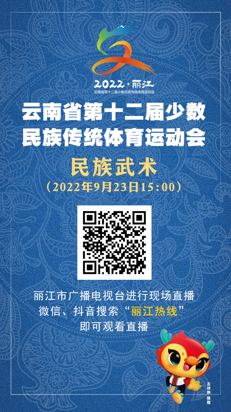 9月23日15:00,麗江市廣播電視臺將通過新媒體平臺對民族武術(shù)項目進(jìn)行現(xiàn)場網(wǎng)絡(luò)直播,微信、抖音搜索“麗江熱線”即可觀看賽事,或點擊下圖進(jìn)入直播間。